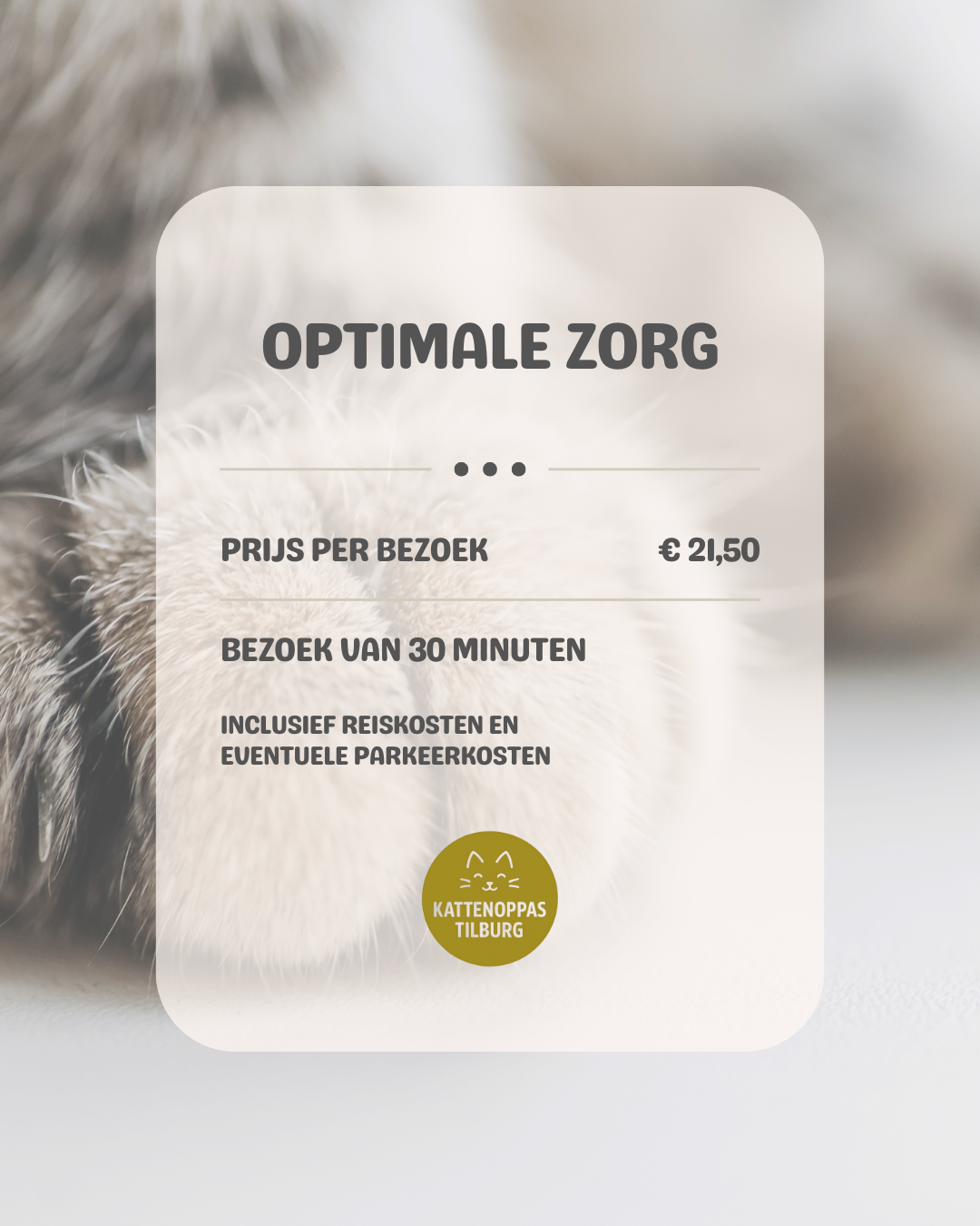 Je betaald per bezoek en dus niet per kat, zo ben je bij meer dan één kat goedkoper uit dan bij een kattenpension of kattenhotel. Bij meer dan 3 katten hanteer ik wel een meerprijs van € 2,50 per kat.